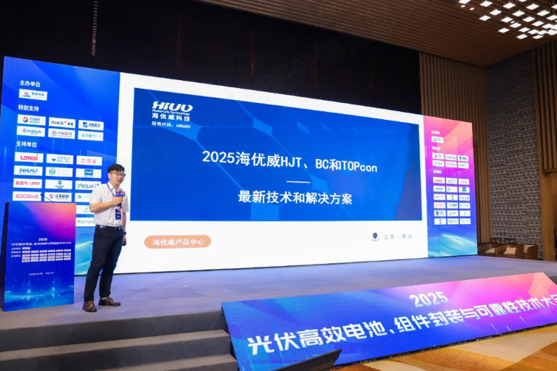 2025年4月22日,恒卓光伏主辦的《2025光伏高效電池、組件封裝與可靠性技術(shù)大會》在蘇州市匯融廣場假日酒店拉開帷幕。本次技術(shù)大會邀請到來自行業(yè)主要電池組件企業(yè)、相關(guān)研究機(jī)構(gòu)、相關(guān)設(shè)備與材料廠家、第三方機(jī)構(gòu)、終端業(yè)主、設(shè)計(jì)院、EPC等頂級技術(shù)專家共聚一堂,共同研討高效電池與組件封裝的技術(shù)發(fā)展趨勢,探討如何更科學(xué)、有效地評估新型組件可靠性,提升產(chǎn)品長期戶外性能,推動光伏行業(yè)技術(shù)持續(xù)進(jìn)步,促進(jìn)各環(huán)節(jié)健康發(fā)展。海優(yōu)威作為本屆大會的VIP應(yīng)邀發(fā)布《2025海優(yōu)威HJT、BC和TOPcon的最新技術(shù)和解決方案》報(bào)告,助力行業(yè)N型電池封裝技術(shù)革新。